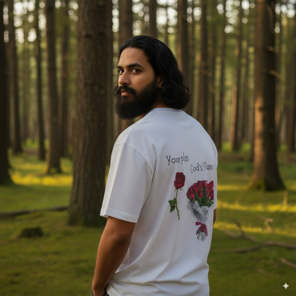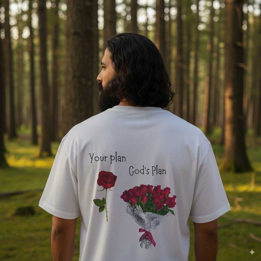Wear a message that speaks to every heart—this tee reminds us that "Your plan < God's Plan." Perfect for seekers of faith and those drawn to uplifting streetwear, this oversized white tee brings spiritual inspiration into daily style.