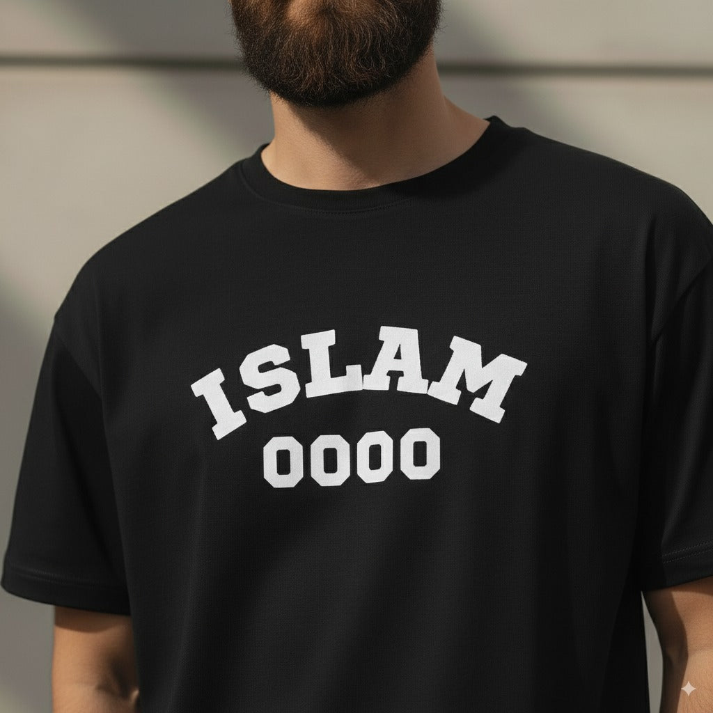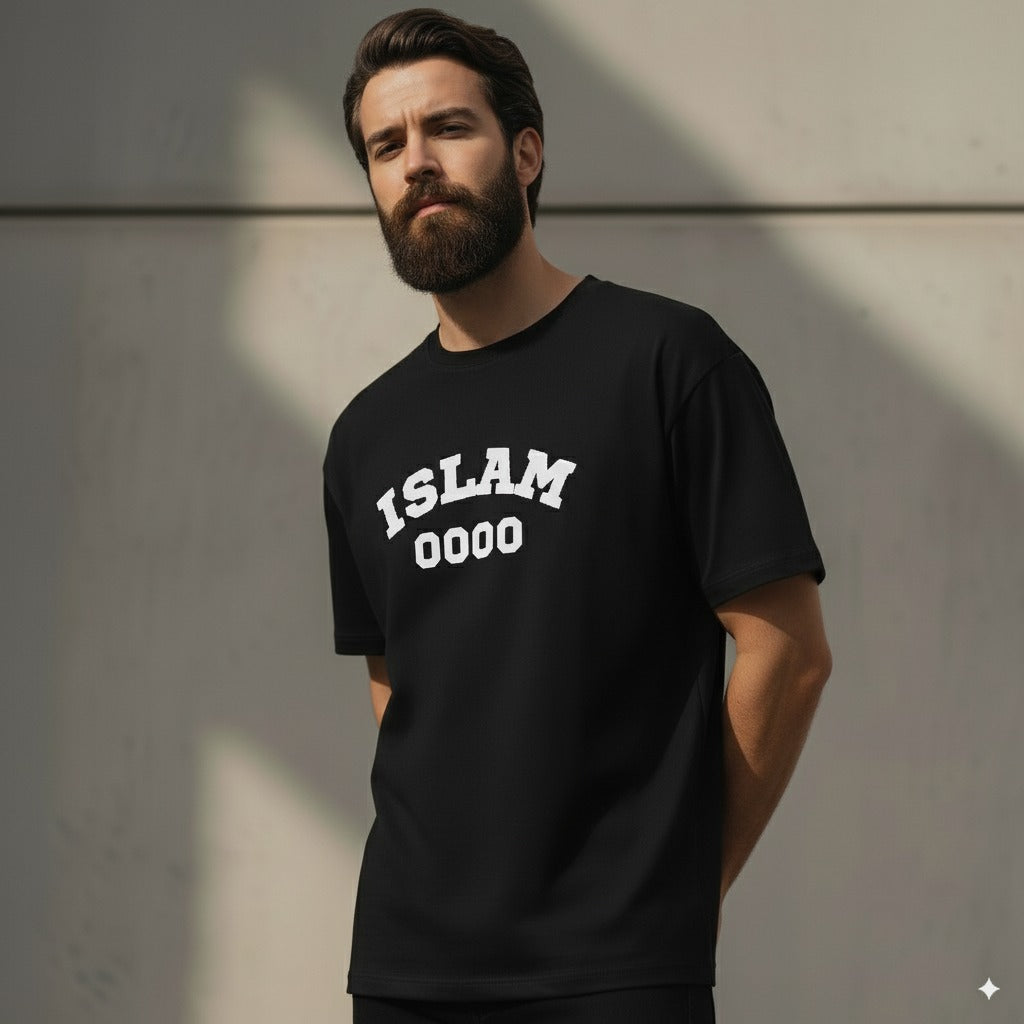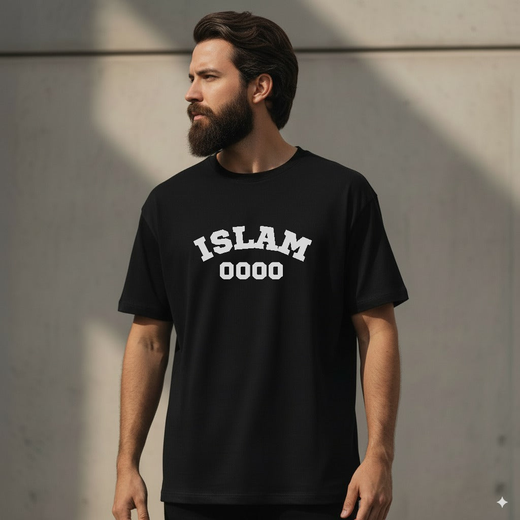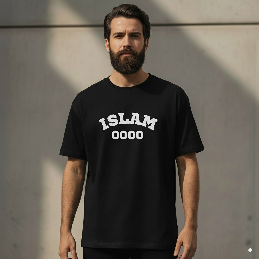 Step into confidence with our Islam Varsity Tee – a bold blend of faith and style. Designed in classic varsity lettering, this black oversized T-shirt carries the word “ISLAM” across the chest with strength and pride. The clean “0000” print below adds a retro-athletic touch, making it a perfect statement piece for modern Muslim youth.