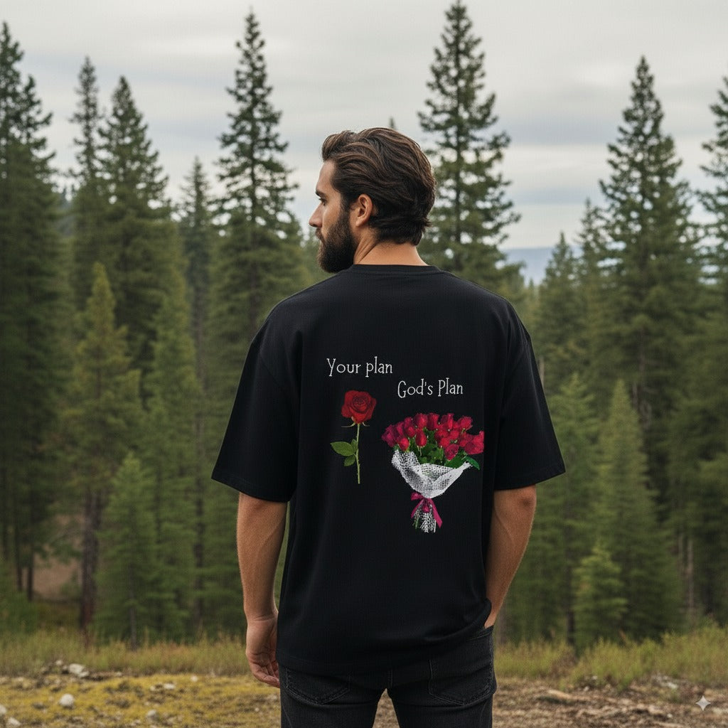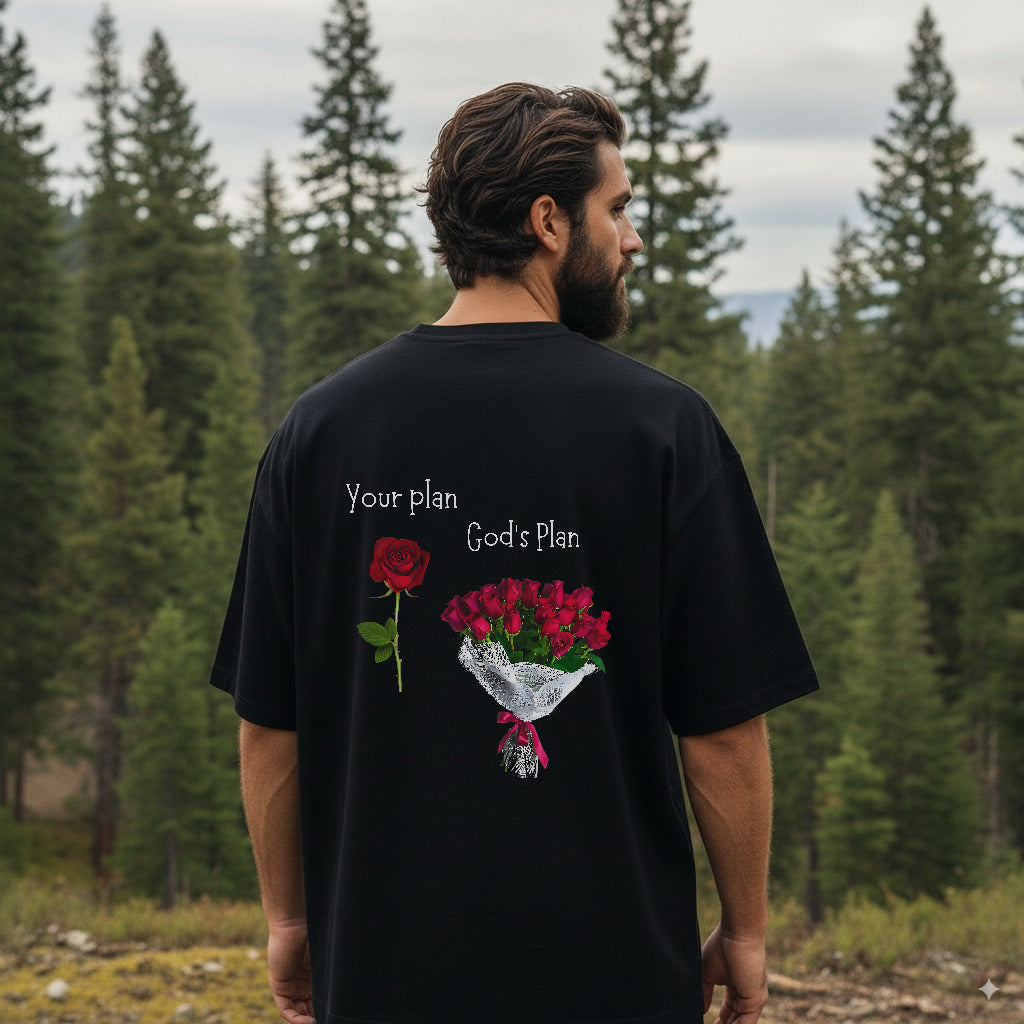 Wear a message that speaks to every heart—this tee reminds us that "Your plan < God's Plan." Perfect for seekers of faith and those drawn to uplifting streetwear, this oversized white tee brings spiritual inspiration into daily style.