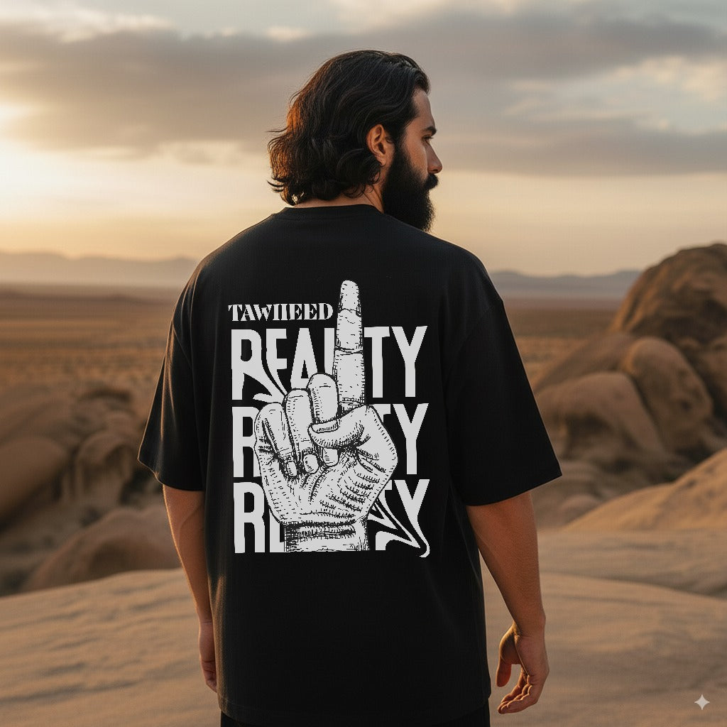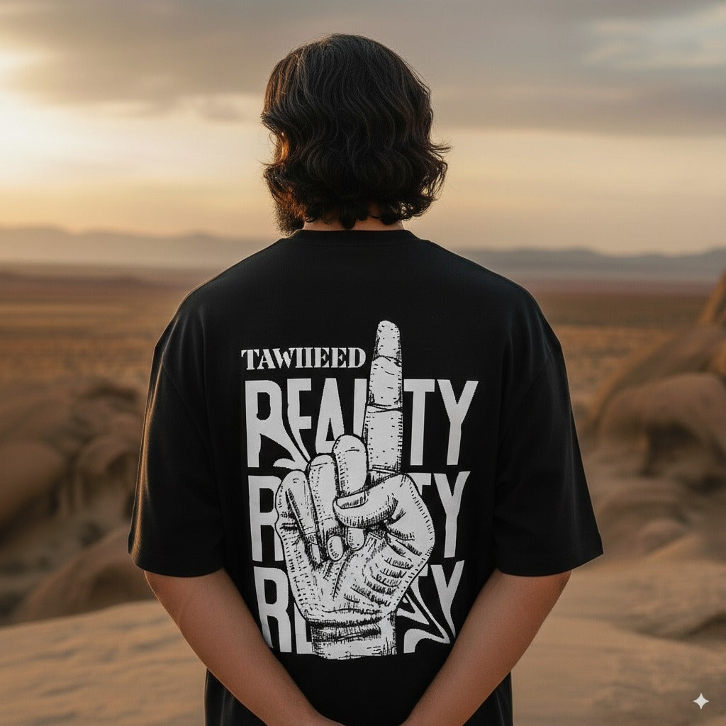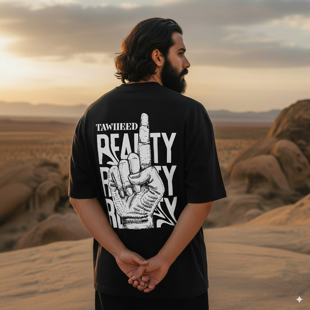 Make a statement of faith and clarity—the Tawheed Reality Tee boldly declares the ultimate truth: the oneness of God. This oversized black tee merges meaningful Islamic streetwear with an unapologetic graphic, making faith both visible and stylish in any setting.