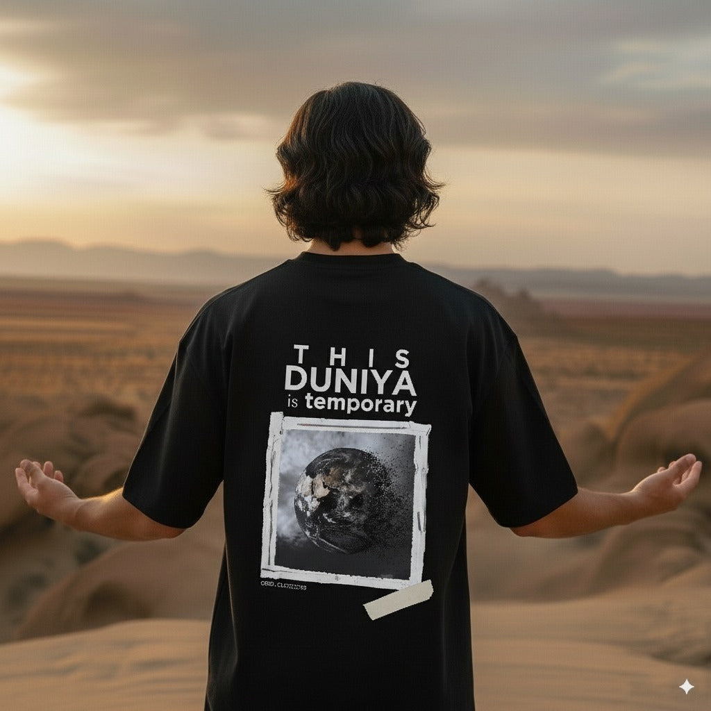 Wear a message that resonates across cultures and faiths—ths Tee reminds us that "This Duniya is Temporary." Perfect for those seeking spiritual reflection and contemporary streetwear, this oversized black tee stands out wherever you go.